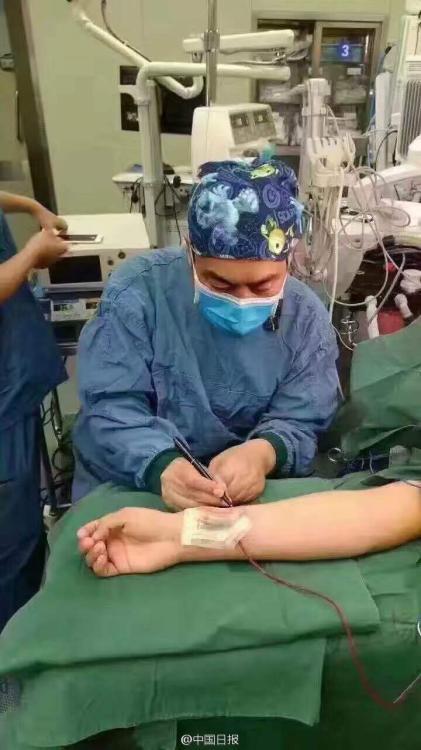 这是西安交大第一附属医院郭树忠教授主刀的一台耳朵再造手术。患者吉某在一年前的车祸中耳廓撕脱缺失。郭教授取了患者的肋软骨雕刻成耳支架,埋置进右前臂扩张好的皮瓣下,待右臂上的的耳朵生长完备后,再通过显微外科的血管吻合技术,移植于头部。记者 单娟 图片来源:中国日报官方微博