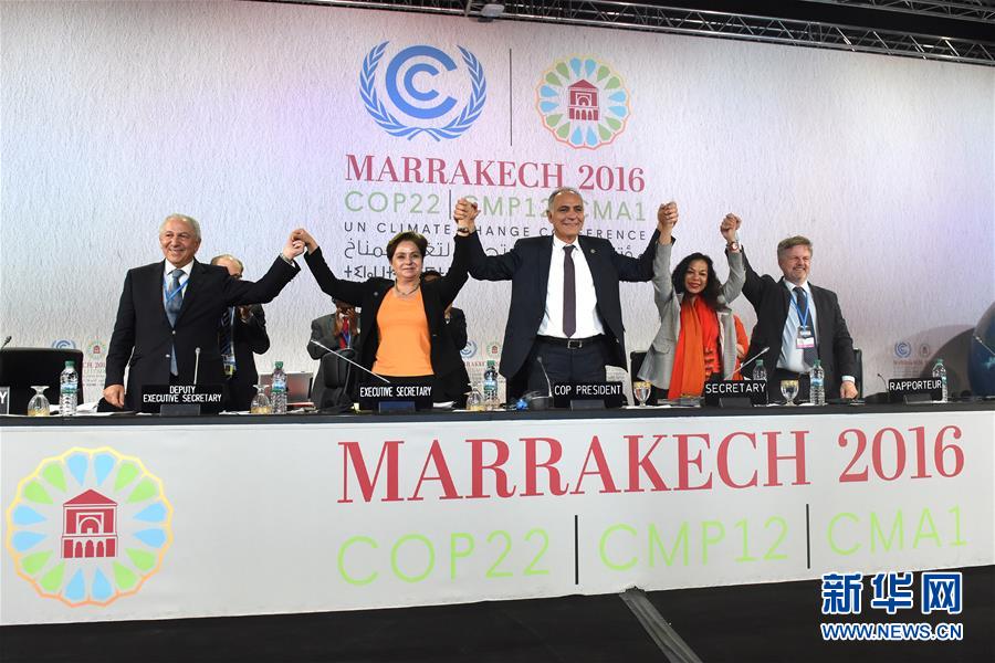 联合国马拉喀什气候大会17日通过《马拉喀什行动宣言》,重申支持《巴黎协定》,强调各方应当作出最大政治承诺,以行动落实协定内容。新华社记者赵丁喆摄