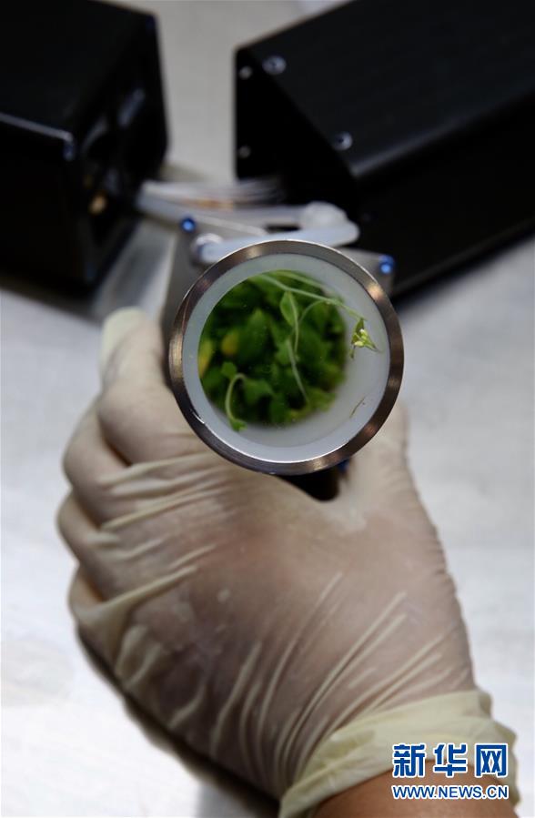 11月18日,在中科院空间应用工程与技术中心,科研人员展示从太空返回并开花的拟南芥。当日,神舟十一号飞船返回舱携带的高等植物培养箱返回单元、空间材料制备实验样品顺利回收并运抵北京。新华社记者 金立旺 摄
