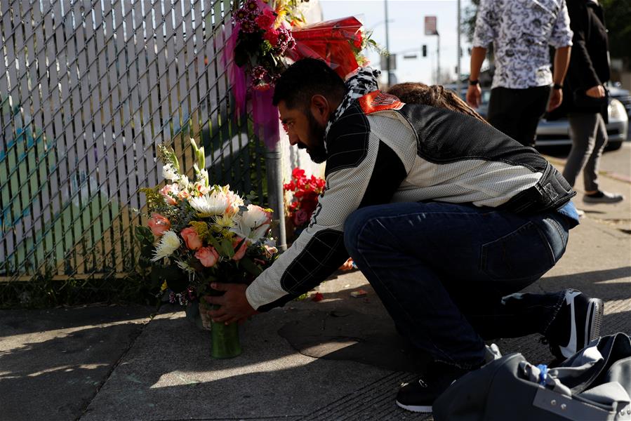 12月4日,在美国奥克兰,一名男子在失火现场附近摆放鲜花悼念。