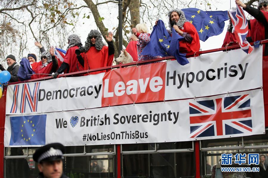 12月5日,在英国伦敦,一辆载着示威者的巴士从英国最高法院外经过。