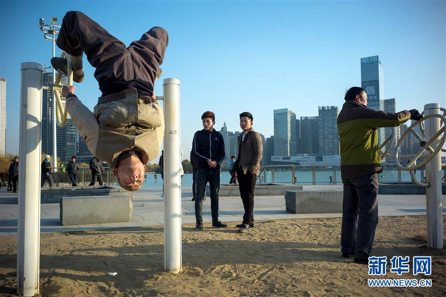 市民在“天鹅湖”边锻炼(2015年12月16日摄)。
