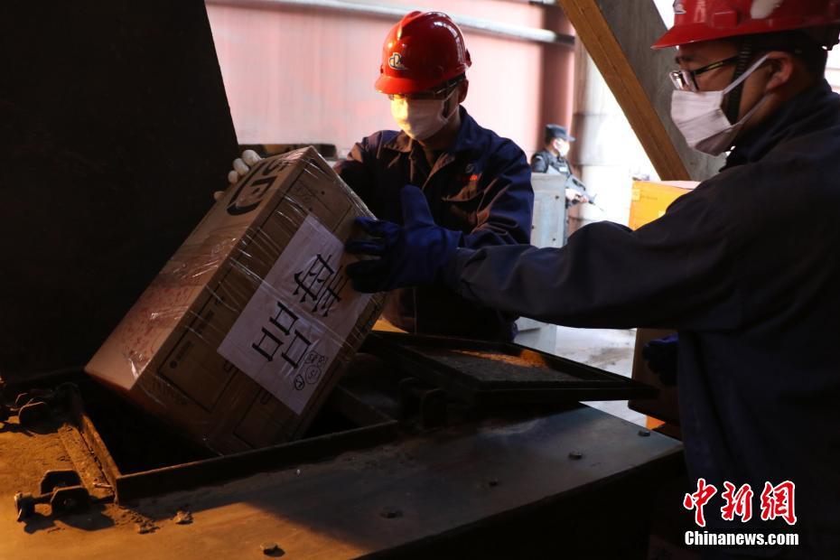 12月16日,杭州富阳区某厂工人将一箱毒品投入焚烧炉。当天,浙江省公安厅在杭州市富阳区将近四年浙江省各级公安机关在缉毒斗争中缴获的部分毒品共计1.042吨公开进行销毁。中新社记者王刚 摄