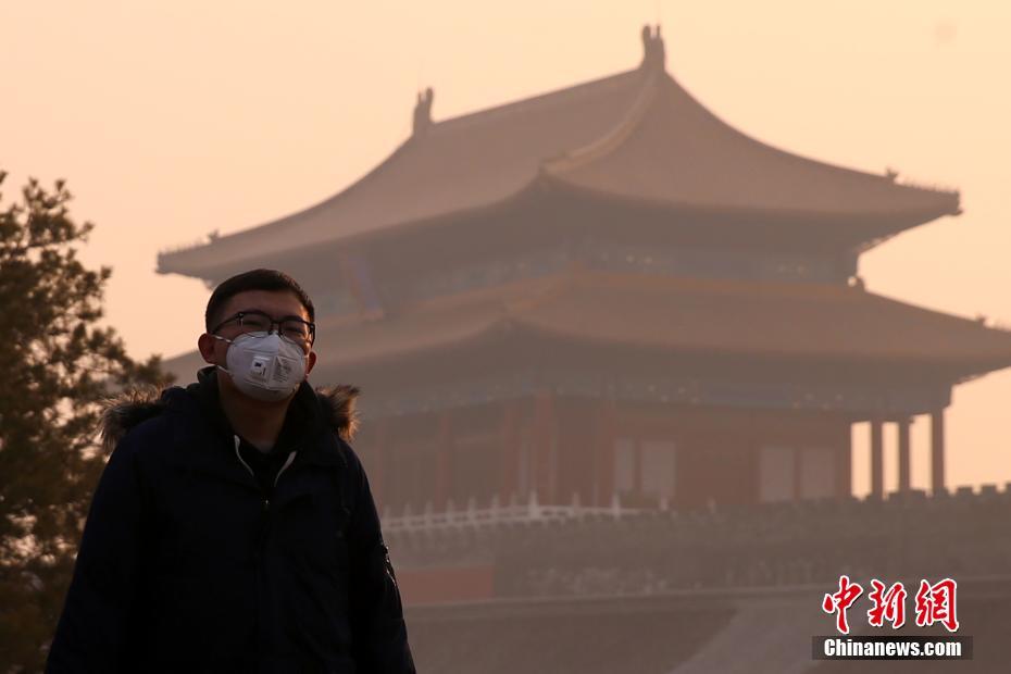 市民在雾霾中出行。北京市空气重污染应急指挥部于12月15日提前发布今年首个空气重污染红色预警,12月16日20时启动各项应急措施,其中包括机动车单双号行驶(电动车除外)、中小学及幼儿园采取弹性教学或停课等。中新社记者韩海丹 摄
