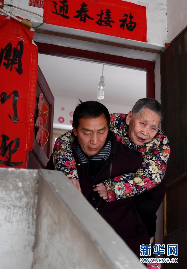 12月26日,陈永清背着老母亲下楼,准备去学校。新华社记者 陶明 摄