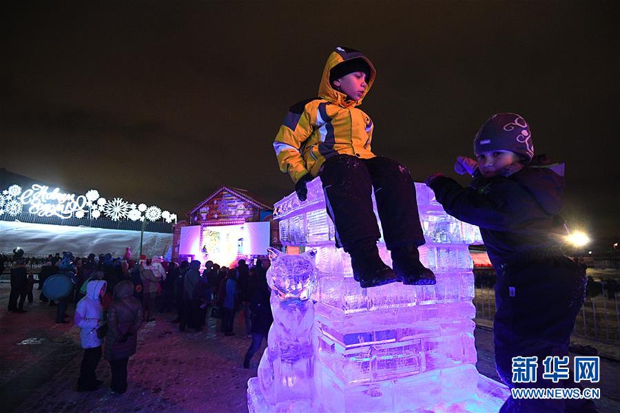 12月29日,在俄罗斯首都莫斯科,孩子们在冰雕上玩耍。当天,2016年“冰雪莫斯科·阖家团圆”新年冰雕艺术节在莫斯科俯首山开幕,活动将持续至2017年1月8日。新华社/卫星社