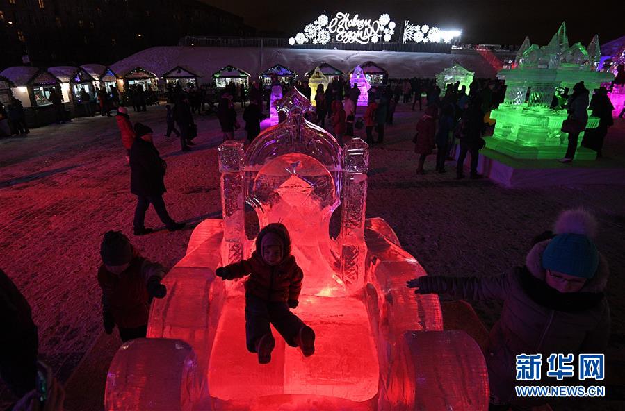 12月29日,在俄罗斯首都莫斯科,孩子们在冰雕上玩耍。当天,2016年“冰雪莫斯科·阖家团圆”新年冰雕艺术节在莫斯科俯首山开幕,活动将持续至2017年1月8日。新华社/卫星社