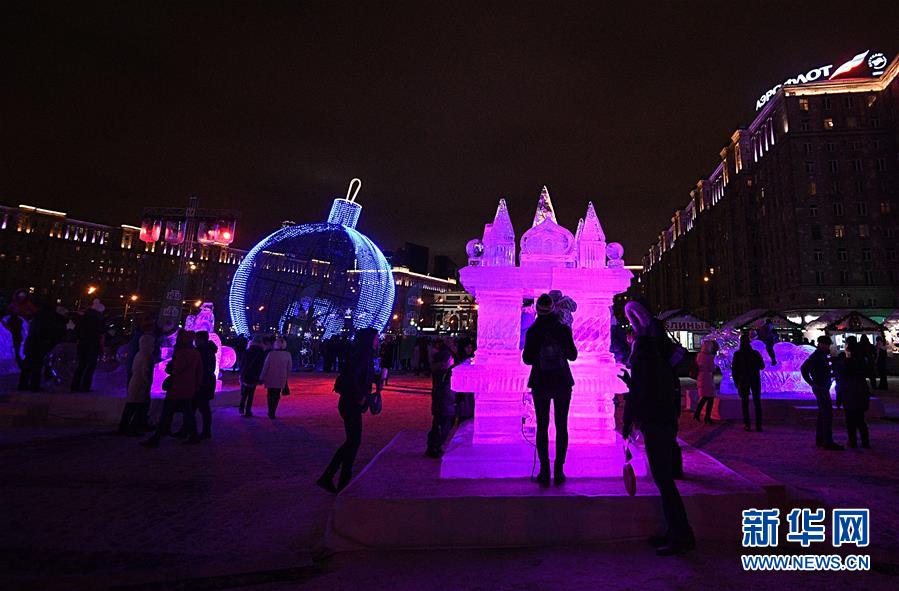 12月29日,在俄罗斯首都莫斯科,游客游览冰雕小镇。当天,2016年“冰雪莫斯科·阖家团圆”新年冰雕艺术节在莫斯科俯首山开幕,活动将持续至2017年1月8日。新华社/卫星社