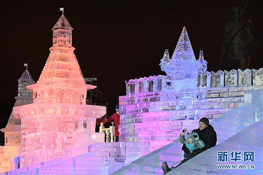 12月29日,在俄罗斯首都莫斯科,一名游客带着孩子在冰雕上滑滑梯。当天,2016年“冰雪莫斯科·阖家团圆”新年冰雕艺术节在莫斯科俯首山开幕,活动将持续至2017年1月8日。新华社/卫星社
