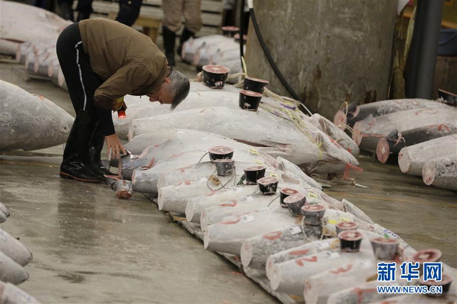 1月5日,日本东京的筑地鱼市场举行今年首场拍卖会。在当日举行的拍卖会上,一条212公斤的蓝鳍金枪鱼以7420万日元(约合63.3万美元)的价格成交,买主是一位寿司店老板。新华社/美联