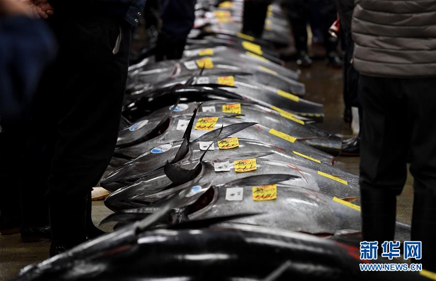 1月5日,日本东京的筑地鱼市场举行今年首场拍卖会。在当日举行的拍卖会上,一条212公斤的蓝鳍金枪鱼以7420万日元(约合63.3万美元)的价格成交,买主是一位寿司店老板。新华社/法新