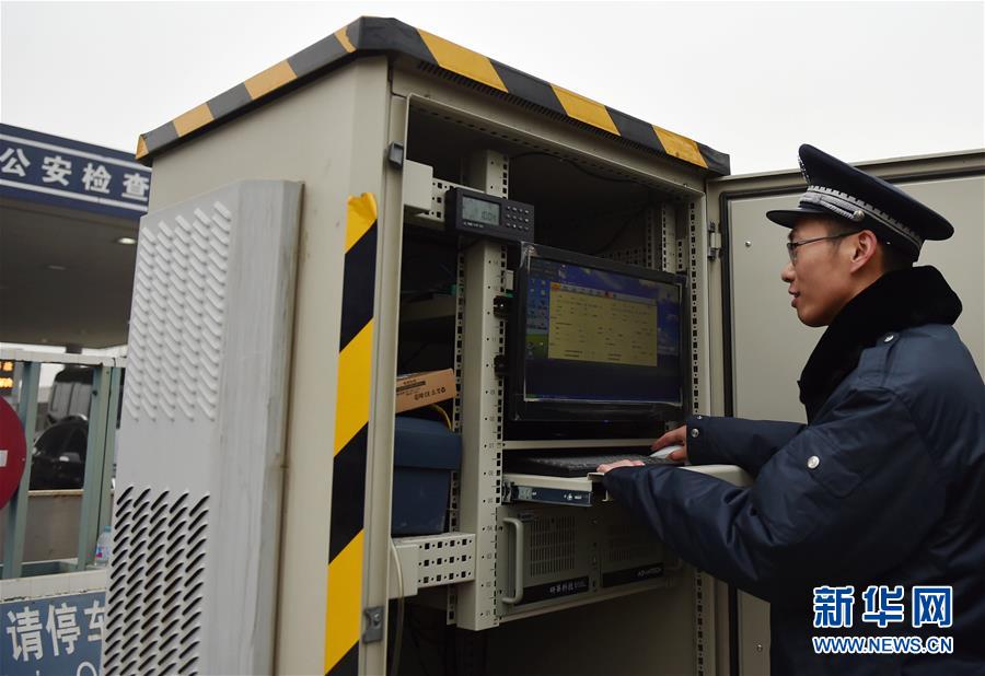 1月5日,工作人员在北京通州区的通燕高速白庙进京检查站查看机动车尾气激光遥测设备。