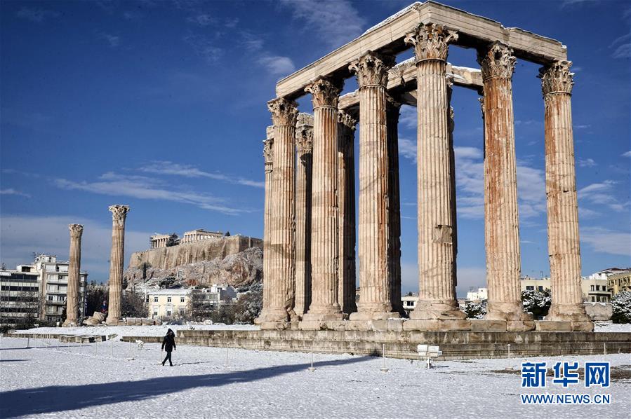 1月10日,在希腊雅典奥林匹亚宙斯神庙,一名女子在大雪后参观。