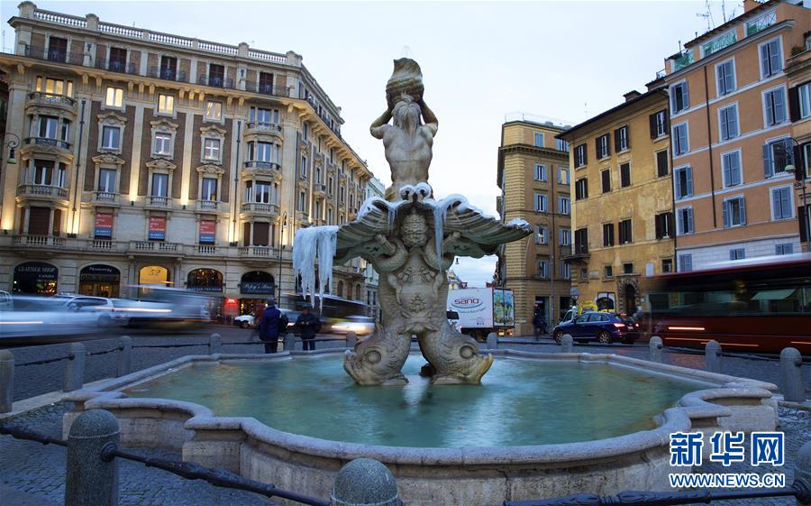 1月10日,意大利首都罗马市中心巴贝里尼广场上的喷泉出现部分结冰。