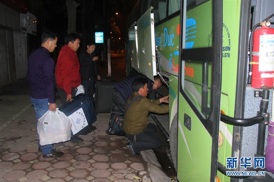 1月15日4时许,在越南首都河内,华越建筑责任有限公司员工往大巴上装行李,准备踏上回家的路。