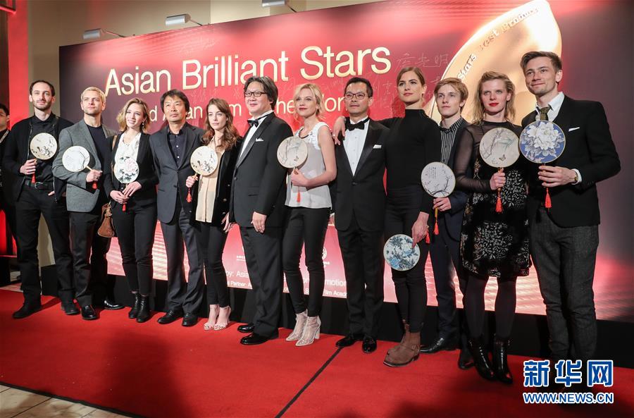2月12日,在德国首都柏林,首届“亚洲璀璨之星”最佳编剧获奖者刘震云(左四)、最佳导演获奖者徐浩峰(左六)、最佳制片人获奖者叶宁(右五)出席颁奖典礼。首届“亚洲璀璨之星”颁奖典礼12日在第67届柏林国际电影节期间举行。中国电影人徐浩峰、刘震云和叶宁分别凭借影片《师父》《一句顶一万句》和《罗曼蒂克消亡史》获得最佳导演、最佳编剧和最佳制片人。新华社记者单宇琦 摄