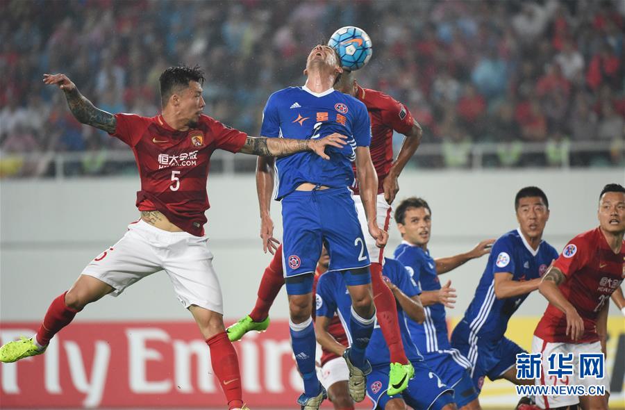 2月22日,广州恒大队球员张琳芃(左一)与香港东方队球员乔什·米切尔在比赛中争顶。当日,在2017年亚冠联赛小组赛G组第一轮比赛中,中国广州恒大队主场以7比0战胜中国香港东方队。新华社记者刘大伟摄