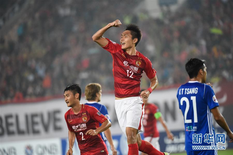 2月22日,广州恒大队球员王上源(上)庆祝进球。当日,在2017年亚冠联赛小组赛G组第一轮比赛中,中国广州恒大队主场以7比0战胜中国香港东方SC队。新华社记者刘大伟摄