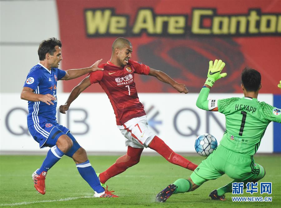 2月22日,广州恒大队球员阿兰(中)在比赛中射门。当日,在2017年亚冠联赛小组赛G组第一轮比赛中,中国广州恒大队主场以7比0战胜中国香港东方队。新华社记者刘大伟摄