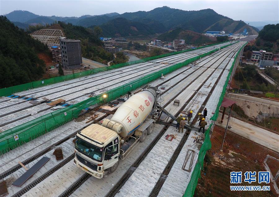 这是正在建设的广西桂三(桂林市至三江侗族自治县)高速公路(2月23日摄)。根据广西壮族自治区政府日前印发的《广西综合交通运输发展“十三五”规划》,“十三五”期间,广西将构建“六横七纵八支线”高速公路网络,全区高速公路里程将达到7000公里左右。新华社记者陆波岸 摄