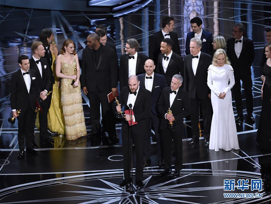 2月26日,在美国洛杉矶好莱坞杜比剧院,《爱乐之城》剧组在乌龙事件中上台“领奖”。