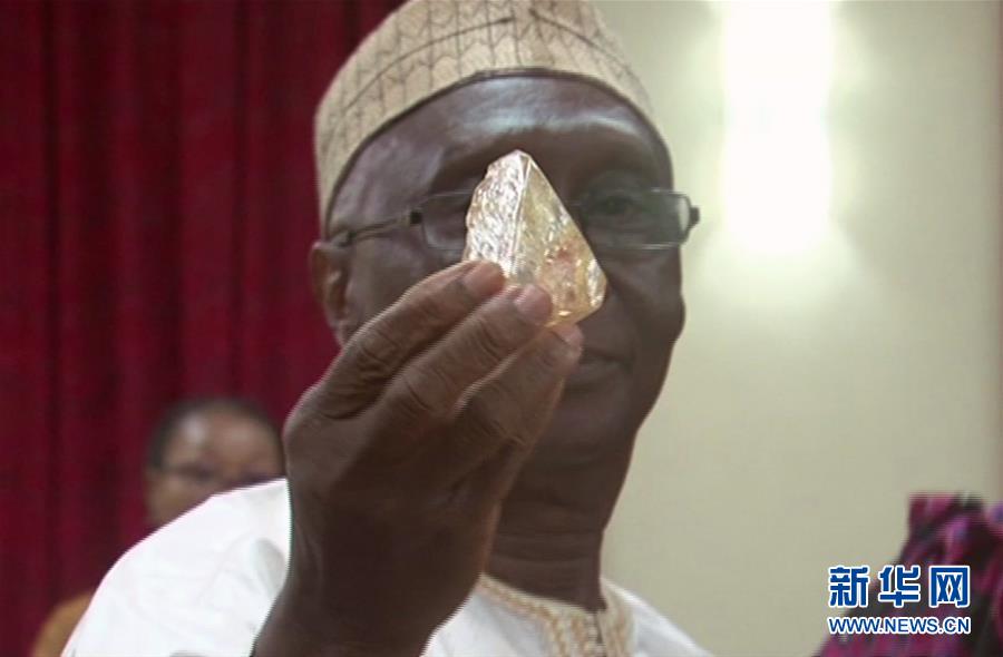 这张视频截图显示的是3月16日,在塞拉利昂弗里敦的总统办公室,塞拉利昂矿产资源部长明凯卢·曼萨雷端详超过700克拉的超大钻石。塞拉利昂总统办公室新闻发言人阿卜杜拉伊·贝雷泰16日向新华社记者确认,塞拉利昂东部省钻石产地科诺区开采出一颗重量超过700克拉的超大钻石。这是塞拉利昂45年来开采出的最大钻石。新华社/美联