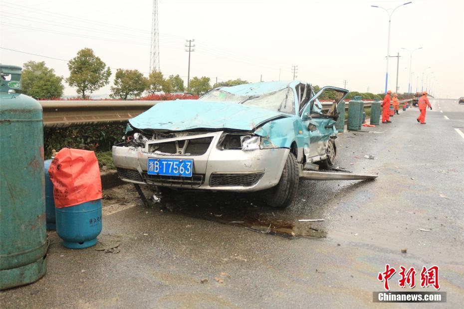 3月20日,浙江一出租车被撞受损事故现场。当天,在浙江省宁波市奉化江口街道,一辆满载煤气瓶的货车与出租车相撞,致一名女驾驶员被困车内,当地各方救援力量展开现场救助。中新社记者陈唐 摄