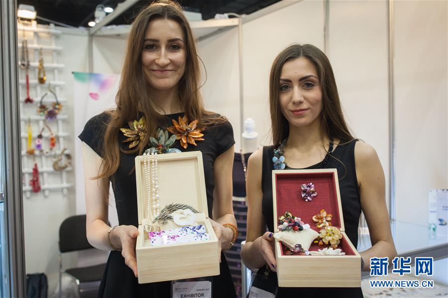 3月22日,在波兰北部海滨城市格但斯克,两名模特在第24届国际琥珀与珠宝饰品博览会上展示琥珀制品。