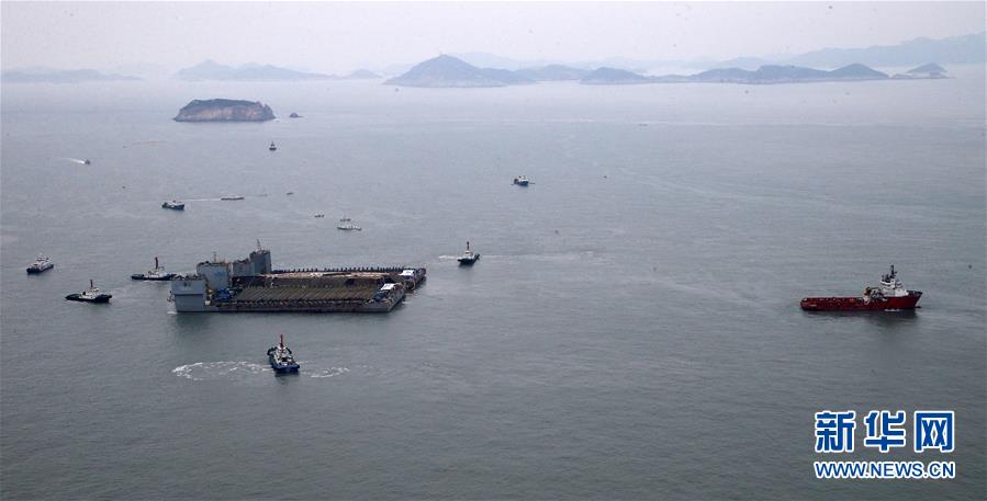 3月24日,在韩国珍岛郡附近海域,“世越”号沉船被牵引向半潜船。韩国“世越”号沉船24日被打捞至移动所需高度,并被牵引至运送其靠岸的半潜船所在水域。工程人员随后把“世越”号船体移至半潜船上方,并将花费两到三天时间进行固定等作业,最终由半潜船把“世越”号船体运送至附近港口。新华社/路透