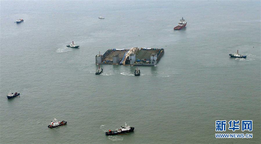3月24日,在韩国珍岛郡附近海域,“世越”号沉船被牵引向半潜船。韩国“世越”号沉船24日被打捞至移动所需高度,并被牵引至运送其靠岸的半潜船所在水域。工程人员随后把“世越”号船体移至半潜船上方,并将花费两到三天时间进行固定等作业,最终由半潜船把“世越”号船体运送至附近港口。新华社/路透