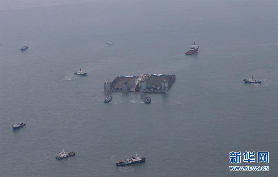 3月24日,在韩国珍岛郡附近海域,“世越”号沉船等待被牵引向半潜船。韩国“世越”号沉船24日被打捞至移动所需高度,并被牵引至运送其靠岸的半潜船所在水域。工程人员随后把“世越”号船体移至半潜船上方,并将花费两到三天时间进行固定等作业,最终由半潜船把“世越”号船体运送至附近港口。新华社/美联