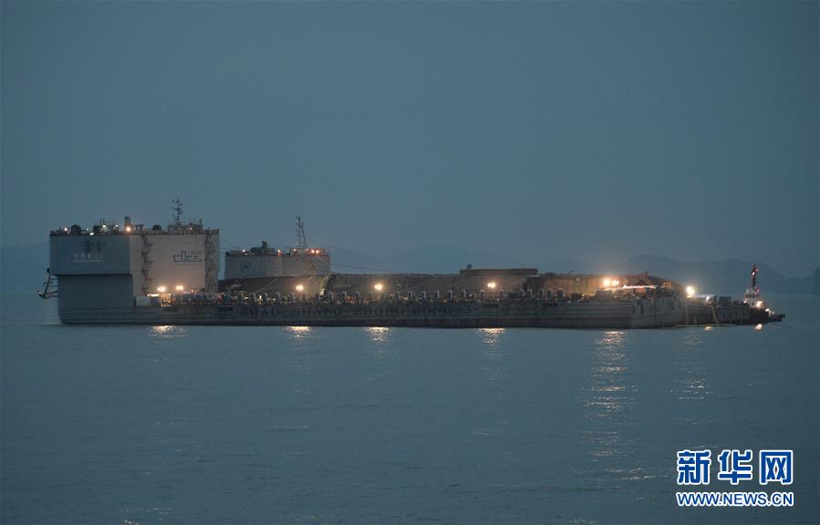 3月24日,在韩国珍岛郡附近海域,“世越”号沉船被牵引向半潜船。韩国“世越”号沉船24日被打捞至移动所需高度,并被牵引至运送其靠岸的半潜船所在水域。工程人员随后把“世越”号船体移至半潜船上方,并将花费两到三天时间进行固定等作业,最终由半潜船把“世越”号船体运送至附近港口。新华社/路透