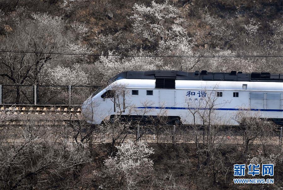 3月28日,一列火车在北京居庸关附近的山花中穿行。近日,北京居庸关长城附近山花烂漫,春意盎然,火车穿行其间,成为春日里一道美丽的风景线。新华社记者 陈晔华 摄