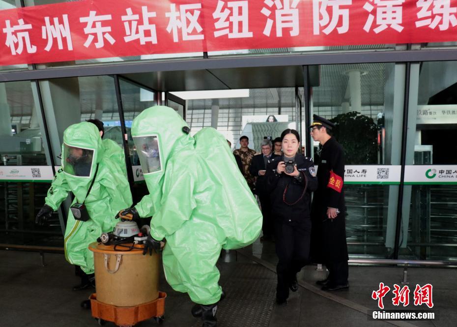 3月28日,消防官兵在杭州火车东站进行化学物质泄漏救援演练。当日,杭州火车东站首次开展多部门、多队伍联合的消防应急演练,通过此次演练加强各部门、单位在人员密集场所的灭火、供水、防化等技能,同时提高各方协同作战、快速反应的能力。中新社记者何蒋勇 摄