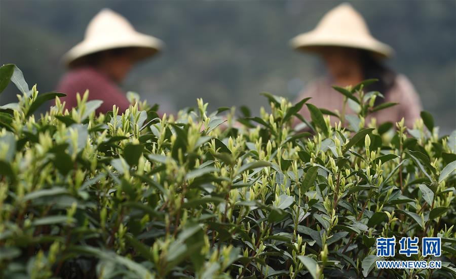 3月28日,采茶工在杭州梅家坞村的茶园里采茶。