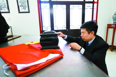 在骨灰领取处,魏童仔仔细细核验骨灰盒上的逝者信息,并准备将骨灰盒包裹好交给逝者家属。整个过程中,他都表情严肃庄重。
