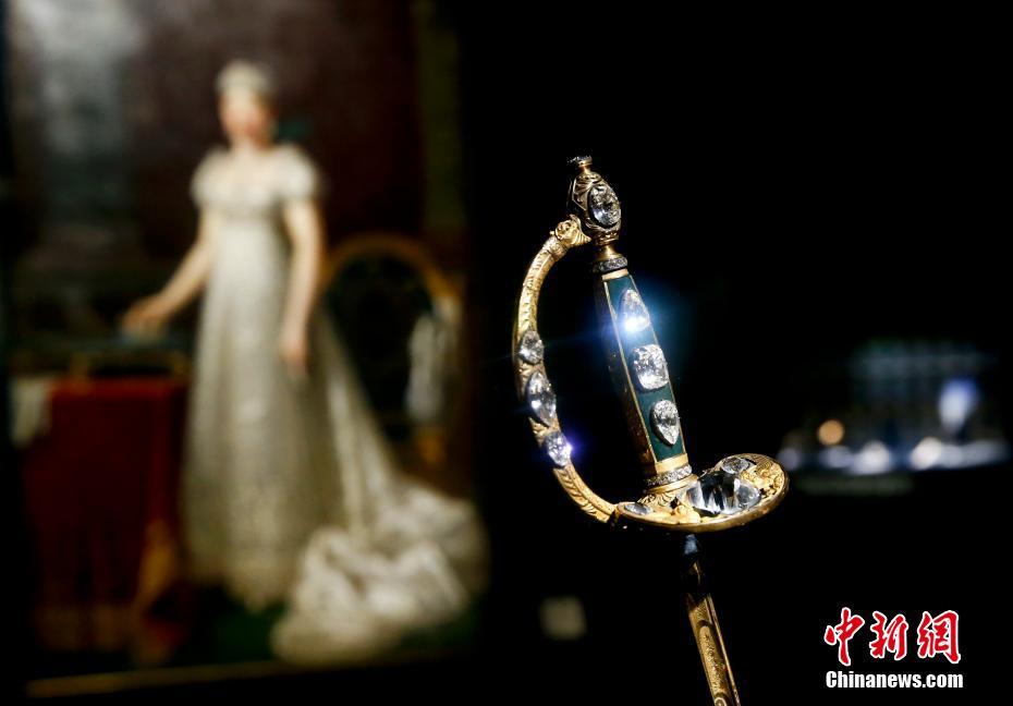 4月7日,北京,300余件中法艺术杰作亮相故宫博物院午门展厅,图为拿破仑“加冕之剑”。故宫博物院携手尚美巴黎CHAUMET,举办 “尚之以琼华——始于十八世纪的珍宝艺术展”,大量18世纪末至21世纪初的尚美巴黎珍宝、绘画以及各式艺术品将贯穿其中。重要的展品包括:拿破仑登基的 “加冕之剑”、为玛丽-露易丝皇后设计的麦穗钻冕,以及法国珠宝史上最具代表性的钻冕作品“波旁·帕尔玛” 金钟花钻冕等。法国卢浮宫博物馆、枫丹白露宫、英国国立维多利亚与艾伯特博物馆均提供了古典珠宝艺术珍藏,其中不乏部分首次走出法国、甚至首次公诸于世的艺术珍品。展览同时还展出了一系列故宫博物院的同类型藏品,作为展览亮点之一与展出的欧洲宫廷古典珠宝艺术品彼此呼应。展览将于4月10日开幕。中新社记者杜洋 摄