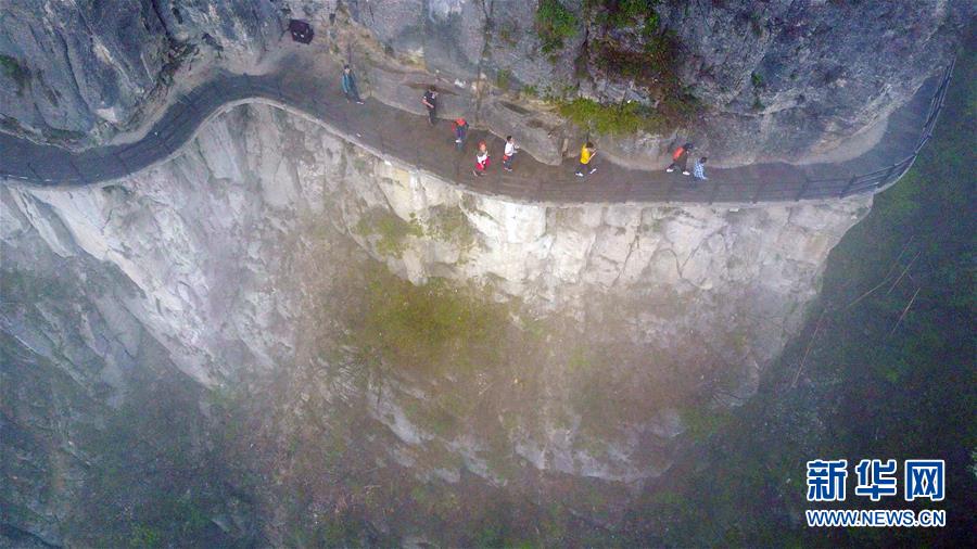 4月16日,游客在恩施大峡谷的绝壁栈道上游览。恩施大峡谷位于湖北恩施土家族苗族自治州恩施市境内,景区内有峡谷、地缝、绝壁、奇峰等地质景观,十分壮美。新华社记者 陈晔华 摄
