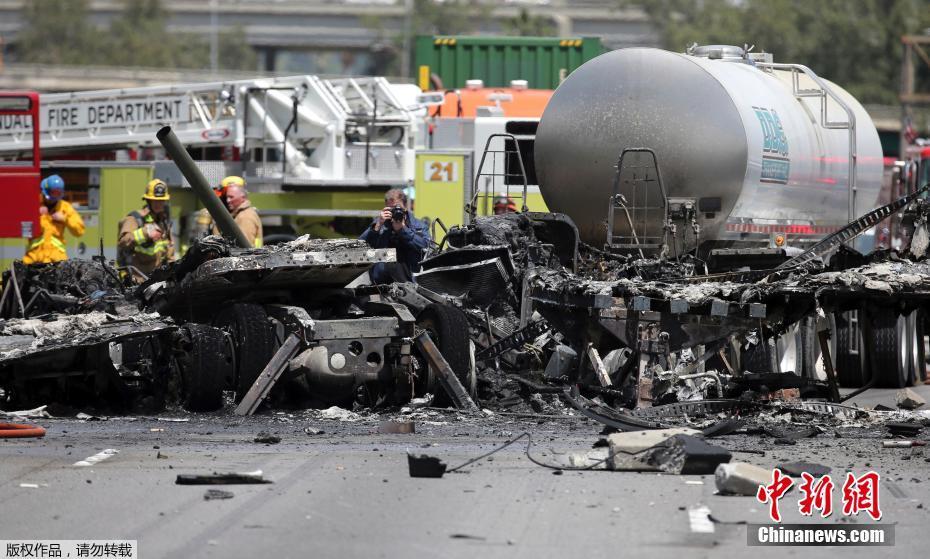 当地时间2017年4月25日,美国加州洛杉矶发生重大交通事故,两辆油罐车与多辆轿车相撞,造成1死9伤,金州高速公路被封锁。