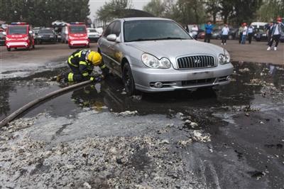 昨天,大兴消防支队黄村中队在位于天宫院的一家报废汽车解体厂内进行了一场杨柳絮引燃车辆的测试实验。解体厂提供了一辆报废伊兰特。新京报记者在现场看到,数秒内测试车辆底部的柳絮就被全部引燃,仅用两分钟整部车辆被火焰包围,数个轮胎在高温下爆炸,现场十分惊险,黑烟四散,空气中弥漫着浓郁的刺鼻气息。