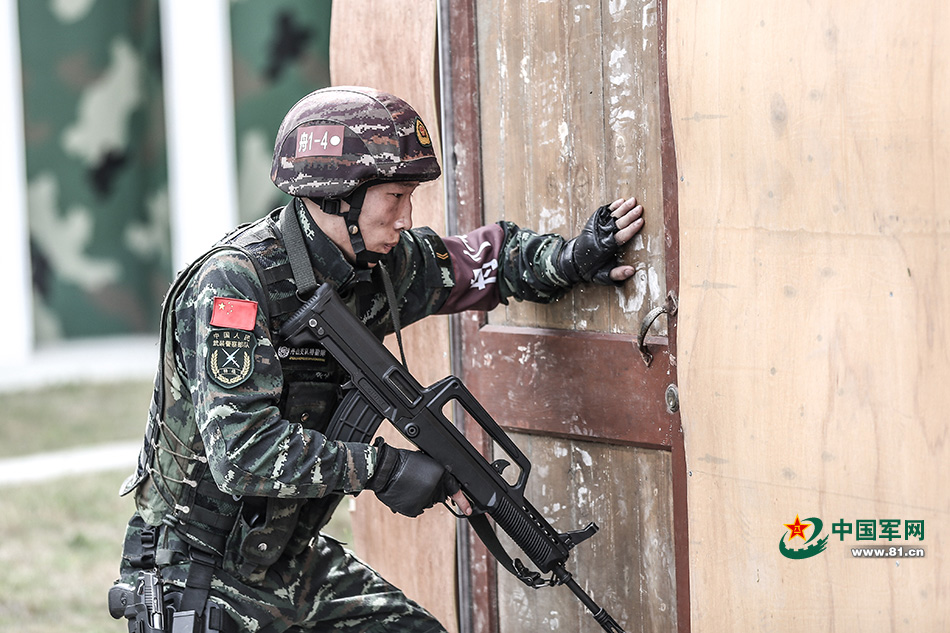 在步枪快速突入射击前,特战队员小心翼翼地感受着门的阻力。
