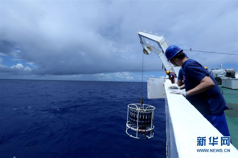 6月3日,科考队员用温盐深仪(CTD)进行海水温度、盐度、深度等常规环境调查。刚刚在马里亚纳海沟完成5次下潜的“蛟龙”号载人潜水器,未来数天内将在雅浦海沟进行5次下潜,6月4日进行第一潜。新华社记者刘诗平 摄