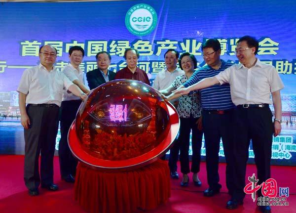 出席新闻发布会的领导和嘉宾共同按下电子启动球,象征着首届中国绿色产业博览会就此正式启动。(韩琳 摄)