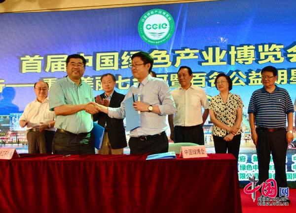 来自黑龙江、浙江、四川等地的绿色产品与首届绿博会和“绿博会”官方指定网络交易平台“绿色中国网络电视绿色商城”签约入驻。图为签约仪式。(韩琳 摄)