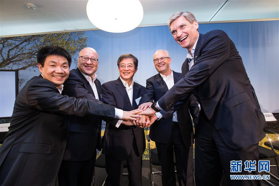 6月27日,在位于瑞士巴塞尔的先正达公司总部,新当选的先正达董事会主席、中国化工董事长任建新(中)和先正达董事会副主席米歇尔·德马尔(右二)与管理团队在记者会上握手。