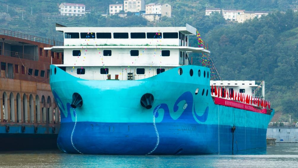万吨级纯电动散货船在湖北宜昌下水舾装 -