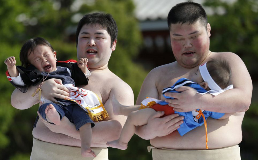 对初次为人父母的夫妇来说,哄孩子不哭可以说是一项严峻的考验,但是对于日本东京的妈妈们来说,情况却不同,她们把孩子交给学习相扑的运动员,让他们互相竞争着让自己孩子嚎啕大哭。日本传统Nakizumo节日,字面意思为“让婴儿哭泣的相扑”,相扑选手各抱一个孩子,进入竞技场所,然后面对面开始拉着脸,制造噪音让孩子们放声大哭。第一个哭的孩子即宣布为获胜者,如果两个孩子同时开始哭,那么冠军是哭声最响亮的那个。如果婴儿不哭,大笑或睡着了(这些都会发生的),那么由裁判用吓人的面具来使宝宝嚎啕大哭并结束比赛。