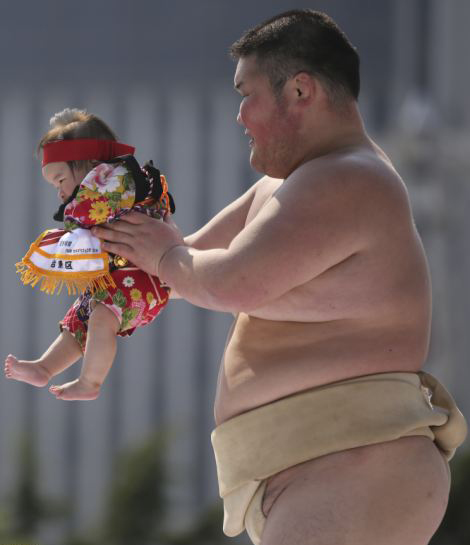 日本传统节日相扑选手比赛惹婴孩哭[组图]
