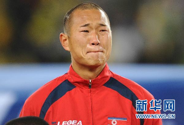 图为2010年6月15日,在南非世界杯小组赛朝鲜队与巴西队的比赛开始前,朝鲜队球员郑大世在朝鲜国歌奏响时泪流满面。 新华社发