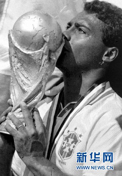 图为1994年7月17日,巴西队前锋罗马里奥在领奖台上亲吻金杯。当日,在洛杉矶进行的世界杯足球赛决赛中,巴西队和意大利队在120分钟的比赛中战成0比0平,经过点球决赛,巴西队最终以3比2战胜意大利队,夺得冠军,成为世界杯历史上第一支四次获得冠军的球队。新华社发